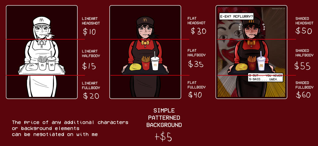 - My art is always changing and evolving as I become a better artist with practice. My work may not always line up with the pictures provided in my commission sheet.